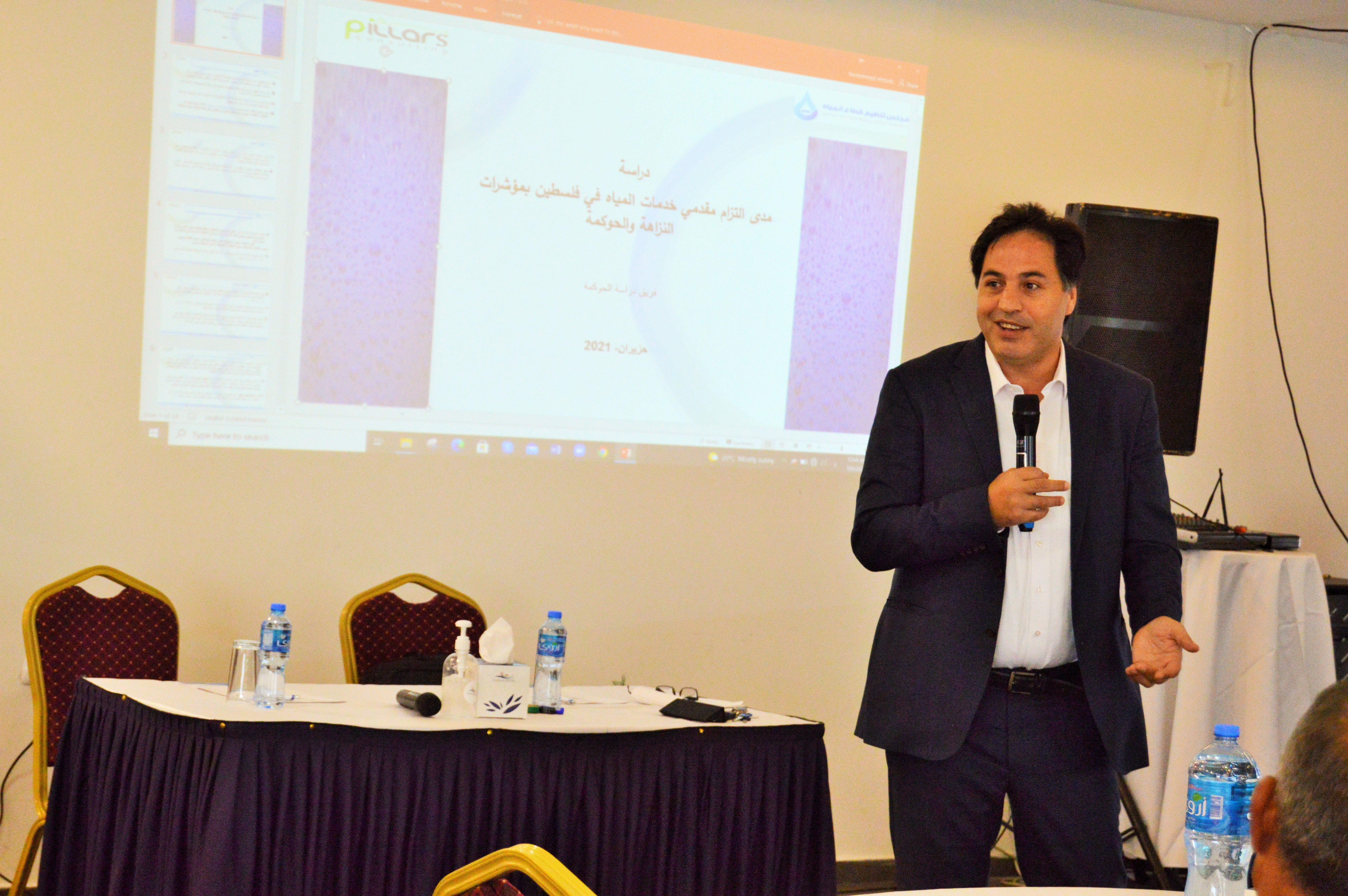 وخلال الورشة عرض فائد عواشرة المدير العام لشركة (بيلارز) أبرز نتائج الدراسة التي قامت الشركة بإعدادها، مبينا مواطن القوة والضعف في مجال تطبيق مبادئ الحوكمة لدى مقدمي الخدمات، مشيرا إلى وجود فروقات في مدى التزام مقدمي خدمات المياه ارتكزت أسبابها بشكل جوهري على حجم ونوع وموقع مقدم الخدمة. كما ناقش عواشرة مع الحضور أهم الحلول التي تسعى إلى معالجة أسباب تراجع الالتزام لدى بعض البلديات والمجالس القروية.